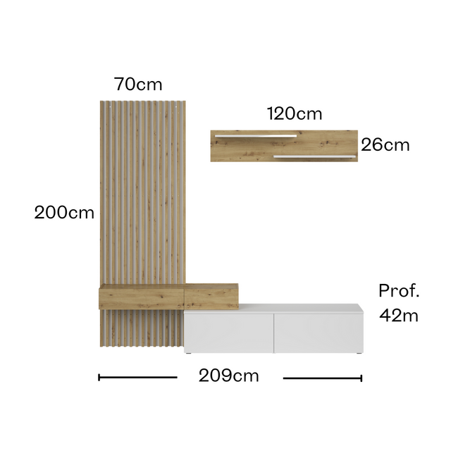 Mueble de televisión. Incluye mueble base de color blanco y madera, panel de pared y repisa.